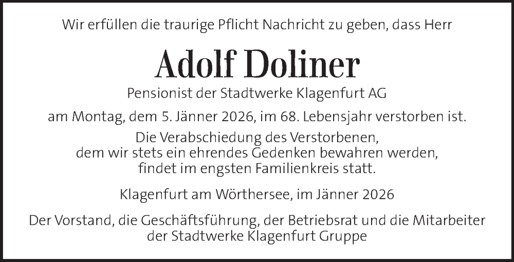 Hier finden Sie alle Traueranzeigen aus der Zeitung, die bisher für Adolf Doliner erschienen sind. Weitere Traueranzeigen, die in der Zeitung erscheinen, werden hier ebenfalls aufgelistet