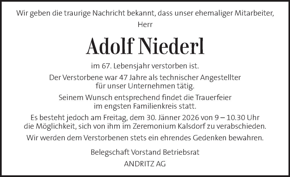 Hier finden Sie alle Traueranzeigen aus der Zeitung, die bisher für Adolf Niederl erschienen sind. Weitere Traueranzeigen, die in der Zeitung erscheinen, werden hier ebenfalls aufgelistet