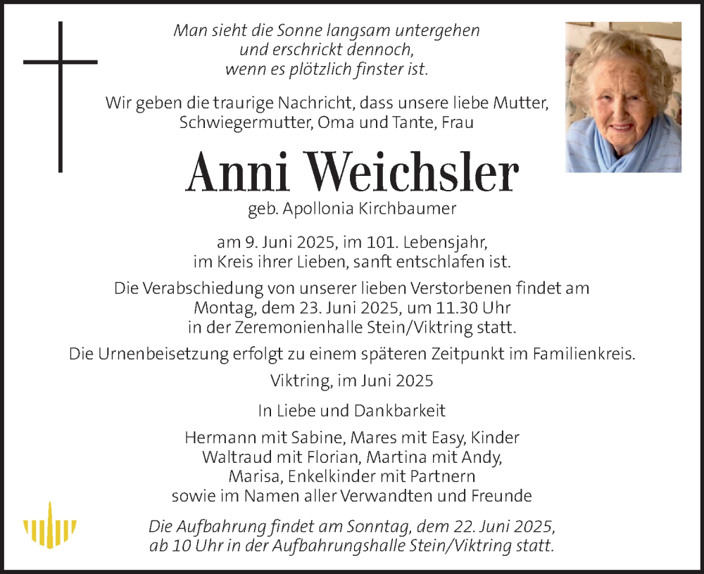 Hier finden Sie alle Traueranzeigen aus der Zeitung, die bisher für Anni Weichsler erschienen sind. Weitere Traueranzeigen, die in der Zeitung erscheinen, werden hier ebenfalls aufgelistet