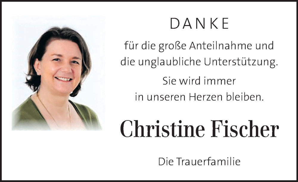 Hier finden Sie alle Traueranzeigen aus der Zeitung, die bisher für Christine Fischer erschienen sind. Weitere Traueranzeigen, die in der Zeitung erscheinen, werden hier ebenfalls aufgelistet