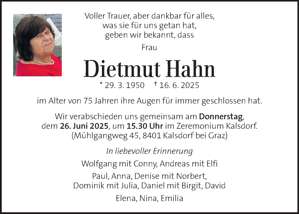 Hier finden Sie alle Traueranzeigen aus der Zeitung, die bisher für Dietmut Hahn erschienen sind. Weitere Traueranzeigen, die in der Zeitung erscheinen, werden hier ebenfalls aufgelistet
