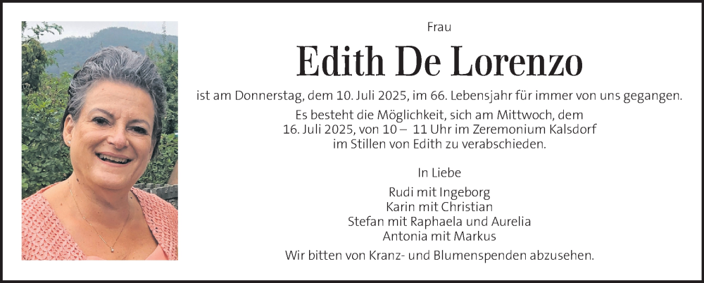 Hier finden Sie alle Traueranzeigen aus der Zeitung, die bisher für Edith De Lorenzo erschienen sind. Weitere Traueranzeigen, die in der Zeitung erscheinen, werden hier ebenfalls aufgelistet