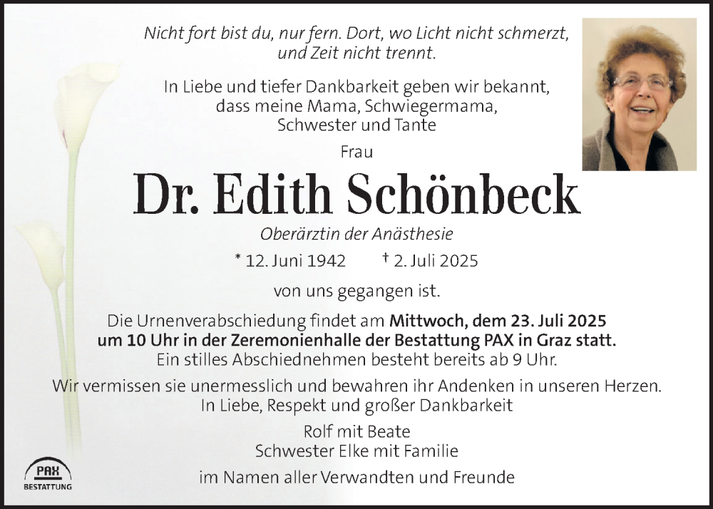 Hier finden Sie alle Traueranzeigen aus der Zeitung, die bisher für Edith Schönbeck erschienen sind. Weitere Traueranzeigen, die in der Zeitung erscheinen, werden hier ebenfalls aufgelistet