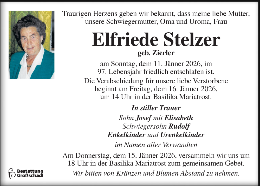 Hier finden Sie alle Traueranzeigen aus der Zeitung, die bisher für Elfriede Stelzer erschienen sind. Weitere Traueranzeigen, die in der Zeitung erscheinen, werden hier ebenfalls aufgelistet