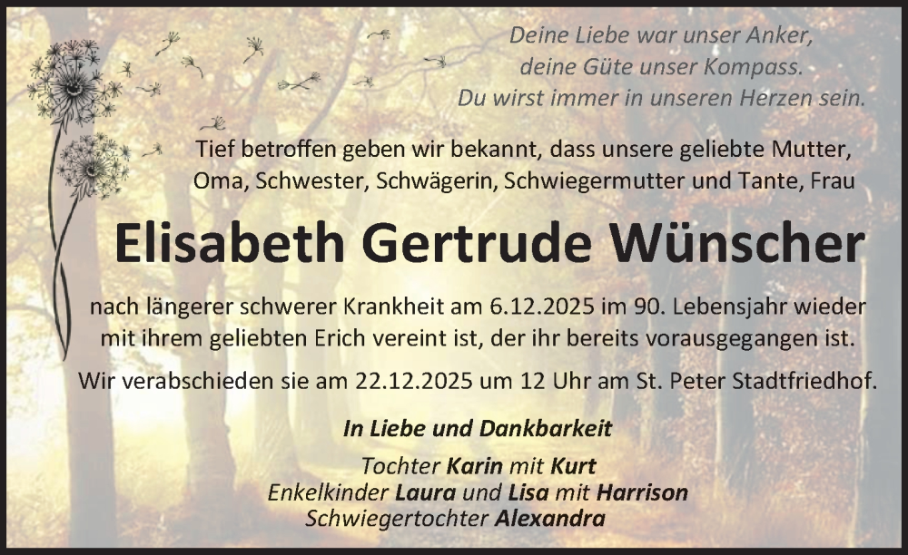 Hier finden Sie alle Traueranzeigen aus der Zeitung, die bisher für Elisabeth Gertrude Wünscher erschienen sind. Weitere Traueranzeigen, die in der Zeitung erscheinen, werden hier ebenfalls aufgelistet