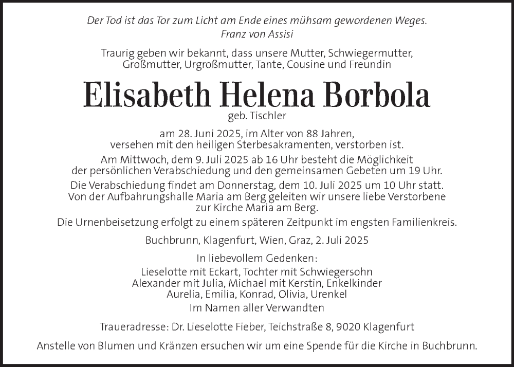 Hier finden Sie alle Traueranzeigen aus der Zeitung, die bisher für Elisabeth Helena Borbola erschienen sind. Weitere Traueranzeigen, die in der Zeitung erscheinen, werden hier ebenfalls aufgelistet