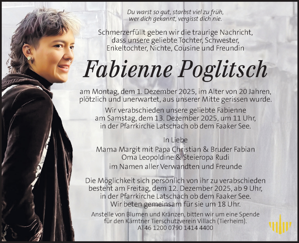 Hier finden Sie alle Traueranzeigen aus der Zeitung, die bisher für Fabienne Poglitsch erschienen sind. Weitere Traueranzeigen, die in der Zeitung erscheinen, werden hier ebenfalls aufgelistet