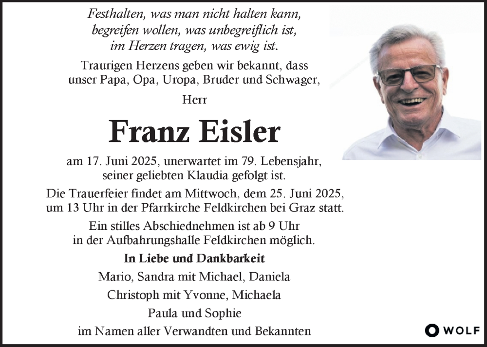 Hier finden Sie alle Traueranzeigen aus der Zeitung, die bisher für Franz Eisler erschienen sind. Weitere Traueranzeigen, die in der Zeitung erscheinen, werden hier ebenfalls aufgelistet