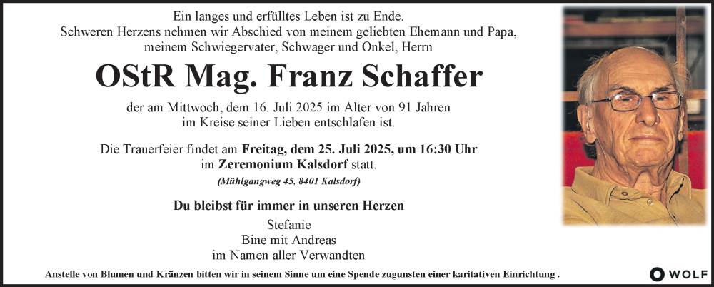 Hier finden Sie alle Traueranzeigen aus der Zeitung, die bisher für Franz Schaffer erschienen sind. Weitere Traueranzeigen, die in der Zeitung erscheinen, werden hier ebenfalls aufgelistet