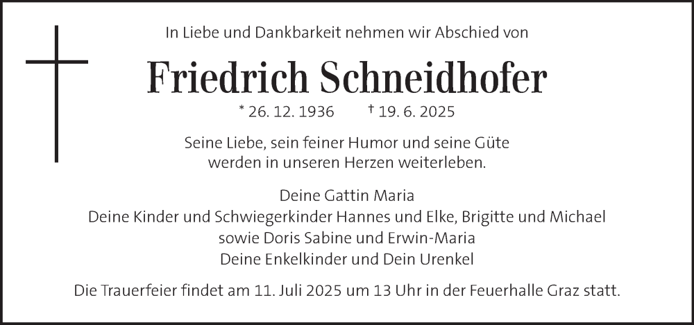 Hier finden Sie alle Traueranzeigen aus der Zeitung, die bisher für Friedrich Schneidhofer erschienen sind. Weitere Traueranzeigen, die in der Zeitung erscheinen, werden hier ebenfalls aufgelistet