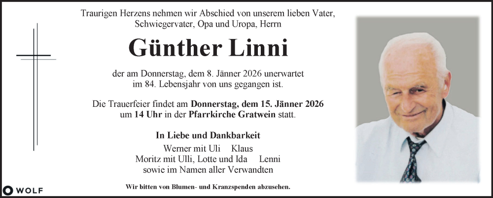 Hier finden Sie alle Traueranzeigen aus der Zeitung, die bisher für Günther Linni erschienen sind. Weitere Traueranzeigen, die in der Zeitung erscheinen, werden hier ebenfalls aufgelistet
