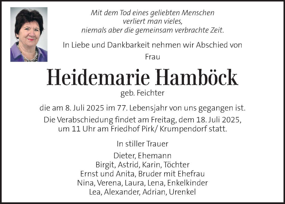 Hier finden Sie alle Traueranzeigen aus der Zeitung, die bisher für Heidemarie Hamböck erschienen sind. Weitere Traueranzeigen, die in der Zeitung erscheinen, werden hier ebenfalls aufgelistet
