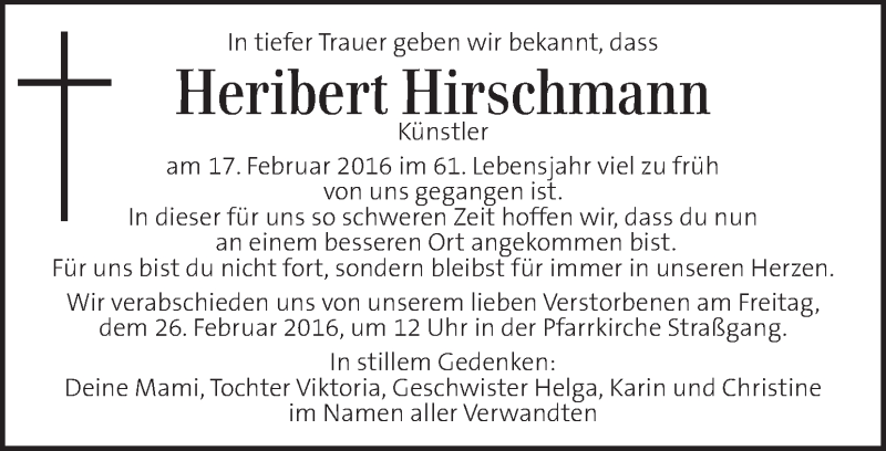 Hier finden Sie alle Traueranzeigen aus der Zeitung, die bisher für Heribert Hirschmann erschienen sind. Weitere Traueranzeigen, die in der Zeitung erscheinen, werden hier ebenfalls aufgelistet