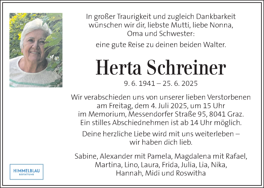 Hier finden Sie alle Traueranzeigen aus der Zeitung, die bisher für Herta Schreiner erschienen sind. Weitere Traueranzeigen, die in der Zeitung erscheinen, werden hier ebenfalls aufgelistet