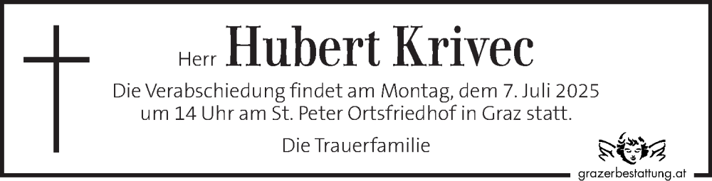 Hier finden Sie alle Traueranzeigen aus der Zeitung, die bisher für Hubert Krivec erschienen sind. Weitere Traueranzeigen, die in der Zeitung erscheinen, werden hier ebenfalls aufgelistet