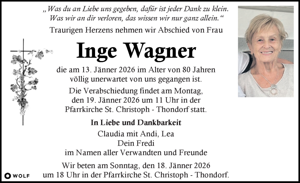 Hier finden Sie alle Traueranzeigen aus der Zeitung, die bisher für Inge Wagner erschienen sind. Weitere Traueranzeigen, die in der Zeitung erscheinen, werden hier ebenfalls aufgelistet