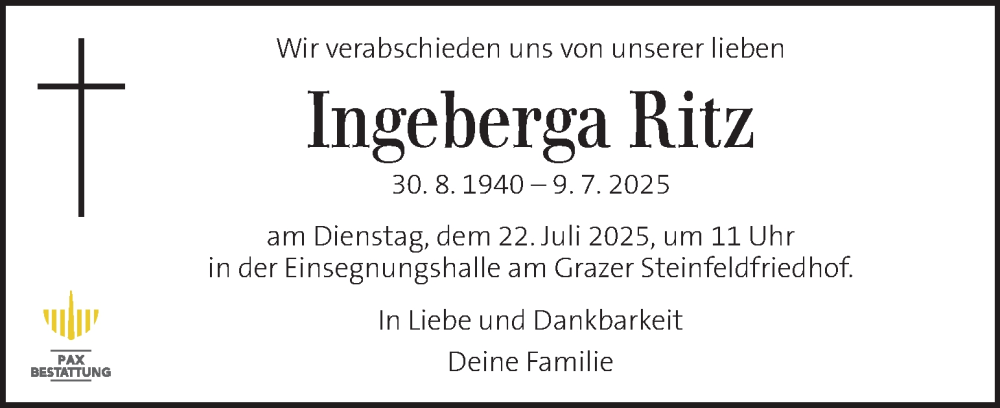 Hier finden Sie alle Traueranzeigen aus der Zeitung, die bisher für Ingeberga Ritz erschienen sind. Weitere Traueranzeigen, die in der Zeitung erscheinen, werden hier ebenfalls aufgelistet