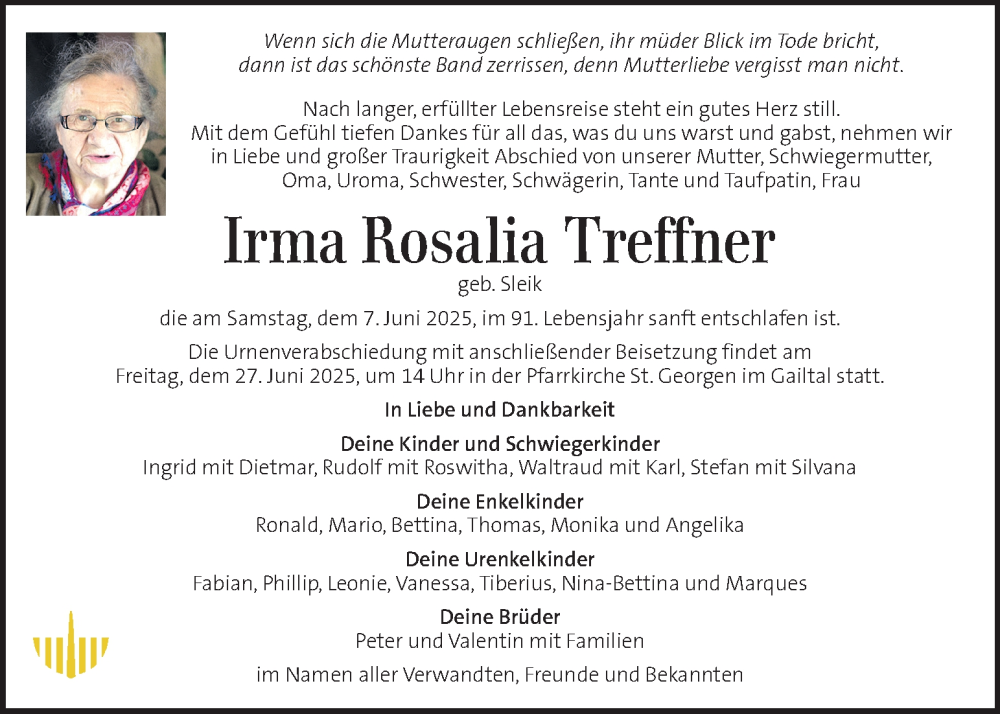 Hier finden Sie alle Traueranzeigen aus der Zeitung, die bisher für Irma Rosalia Treffner erschienen sind. Weitere Traueranzeigen, die in der Zeitung erscheinen, werden hier ebenfalls aufgelistet