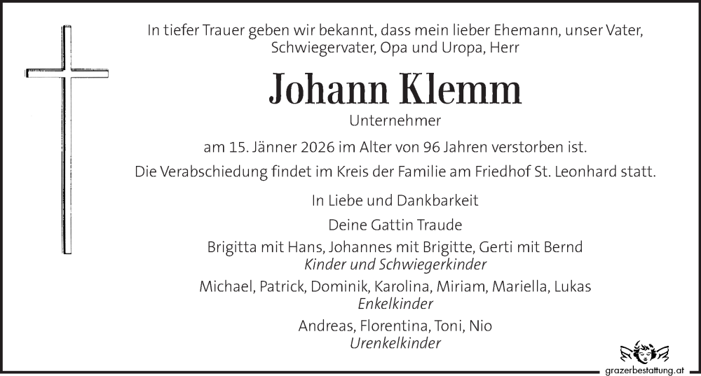 Hier finden Sie alle Traueranzeigen aus der Zeitung, die bisher für Johann Klemm erschienen sind. Weitere Traueranzeigen, die in der Zeitung erscheinen, werden hier ebenfalls aufgelistet