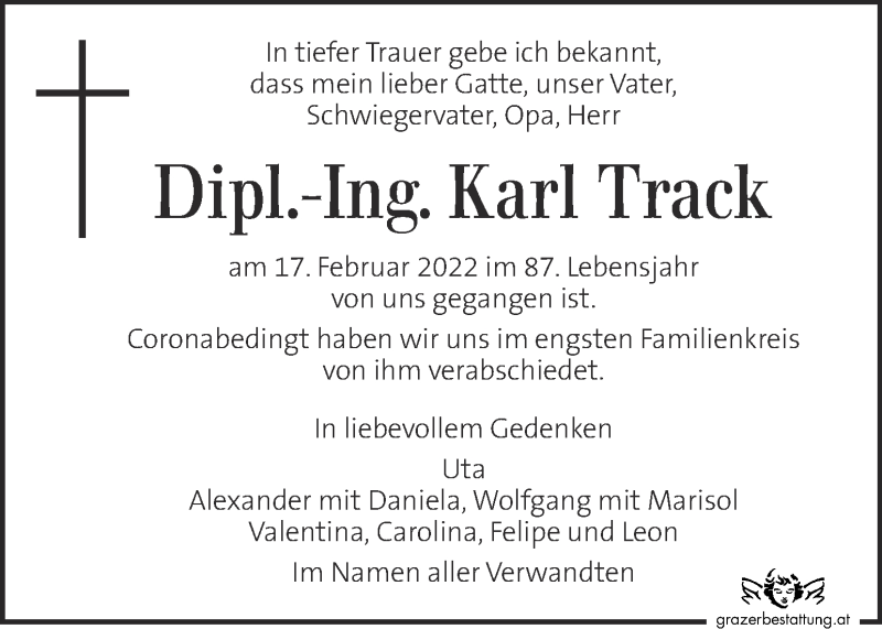 Hier finden Sie alle Traueranzeigen aus der Zeitung, die bisher für Karl Track erschienen sind. Weitere Traueranzeigen, die in der Zeitung erscheinen, werden hier ebenfalls aufgelistet