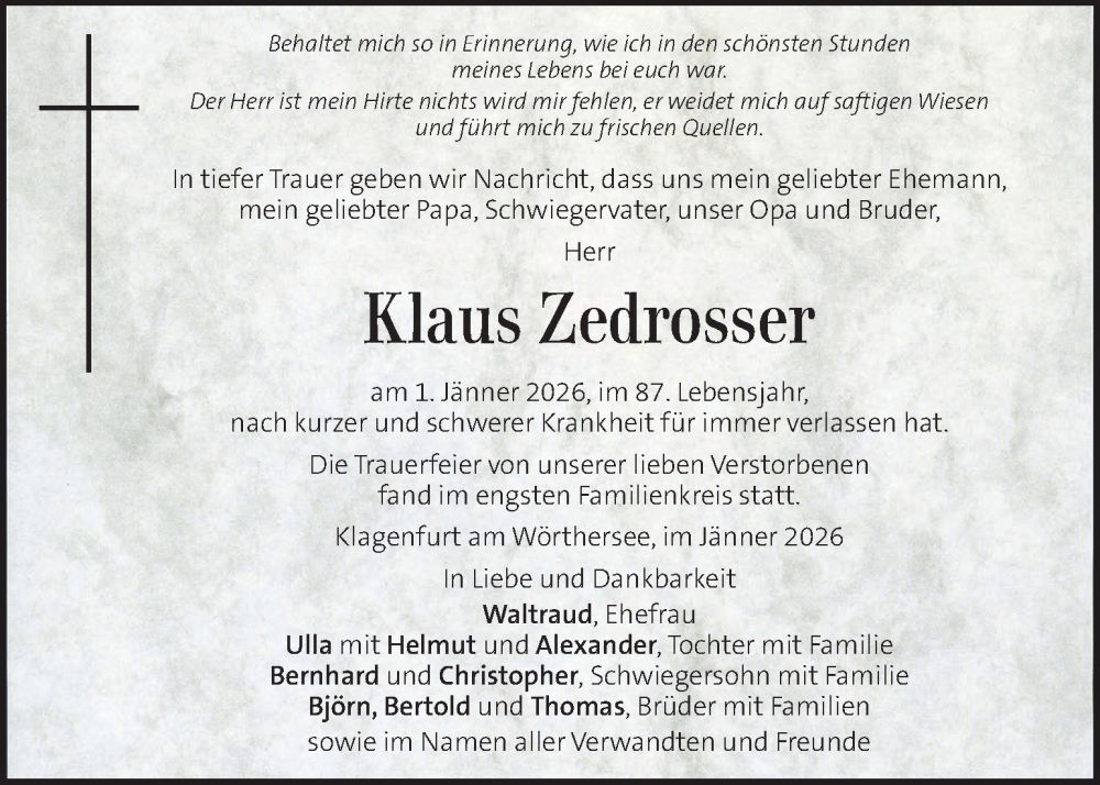 Hier finden Sie alle Traueranzeigen aus der Zeitung, die bisher für Klaus Zedrosser erschienen sind. Weitere Traueranzeigen, die in der Zeitung erscheinen, werden hier ebenfalls aufgelistet