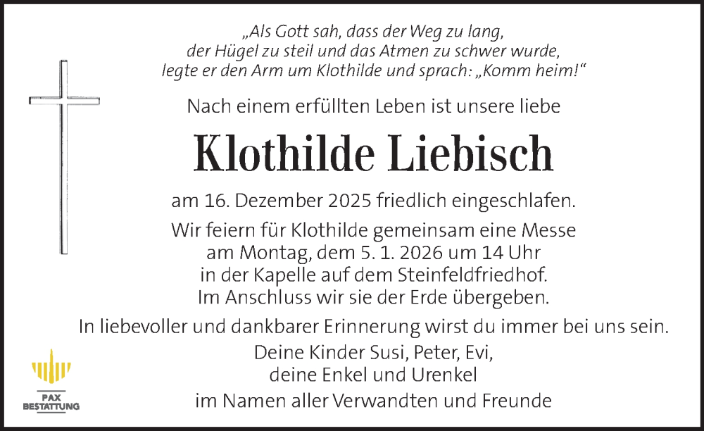 Hier finden Sie alle Traueranzeigen aus der Zeitung, die bisher für Klothilde Liebisch erschienen sind. Weitere Traueranzeigen, die in der Zeitung erscheinen, werden hier ebenfalls aufgelistet