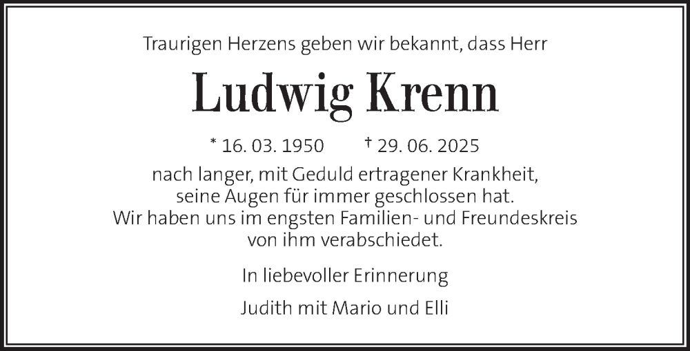 Hier finden Sie alle Traueranzeigen aus der Zeitung, die bisher für Ludwig Krenn erschienen sind. Weitere Traueranzeigen, die in der Zeitung erscheinen, werden hier ebenfalls aufgelistet