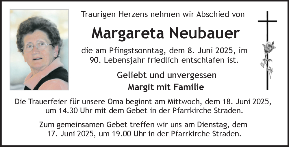Hier finden Sie alle Traueranzeigen aus der Zeitung, die bisher für Margareta Neubauer erschienen sind. Weitere Traueranzeigen, die in der Zeitung erscheinen, werden hier ebenfalls aufgelistet