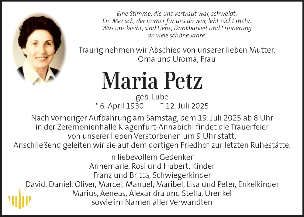 Hier finden Sie alle Traueranzeigen aus der Zeitung, die bisher für Maria Petz erschienen sind. Weitere Traueranzeigen, die in der Zeitung erscheinen, werden hier ebenfalls aufgelistet
