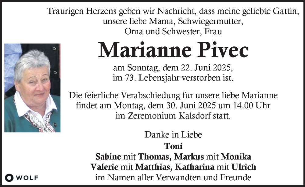 Hier finden Sie alle Traueranzeigen aus der Zeitung, die bisher für Marianne Pivec erschienen sind. Weitere Traueranzeigen, die in der Zeitung erscheinen, werden hier ebenfalls aufgelistet
