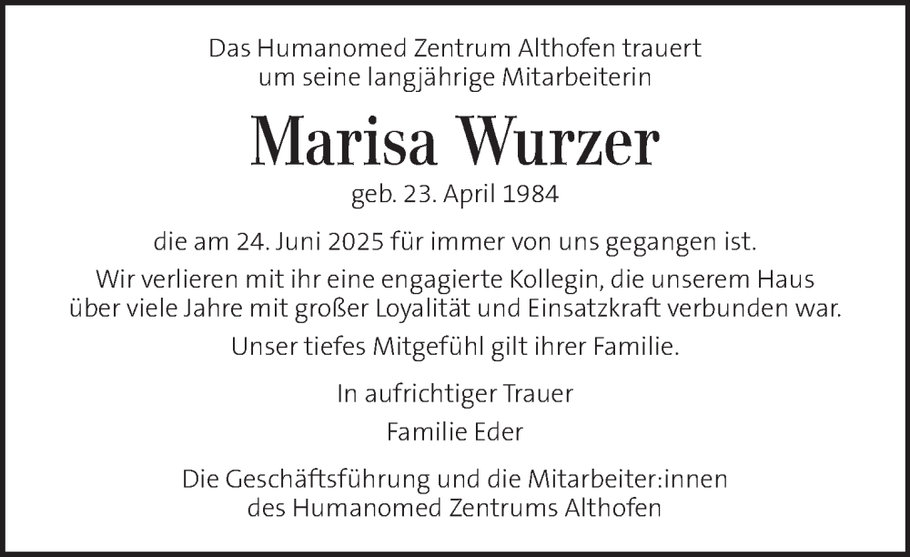 Hier finden Sie alle Traueranzeigen aus der Zeitung, die bisher für Marisa Wurzer erschienen sind. Weitere Traueranzeigen, die in der Zeitung erscheinen, werden hier ebenfalls aufgelistet