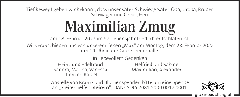 Hier finden Sie alle Traueranzeigen aus der Zeitung, die bisher für Maximilian Zmug erschienen sind. Weitere Traueranzeigen, die in der Zeitung erscheinen, werden hier ebenfalls aufgelistet