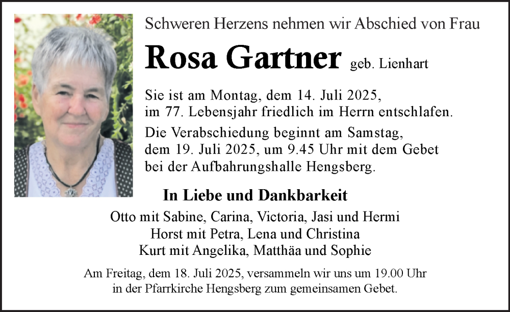 Hier finden Sie alle Traueranzeigen aus der Zeitung, die bisher für Rosa Gartner erschienen sind. Weitere Traueranzeigen, die in der Zeitung erscheinen, werden hier ebenfalls aufgelistet