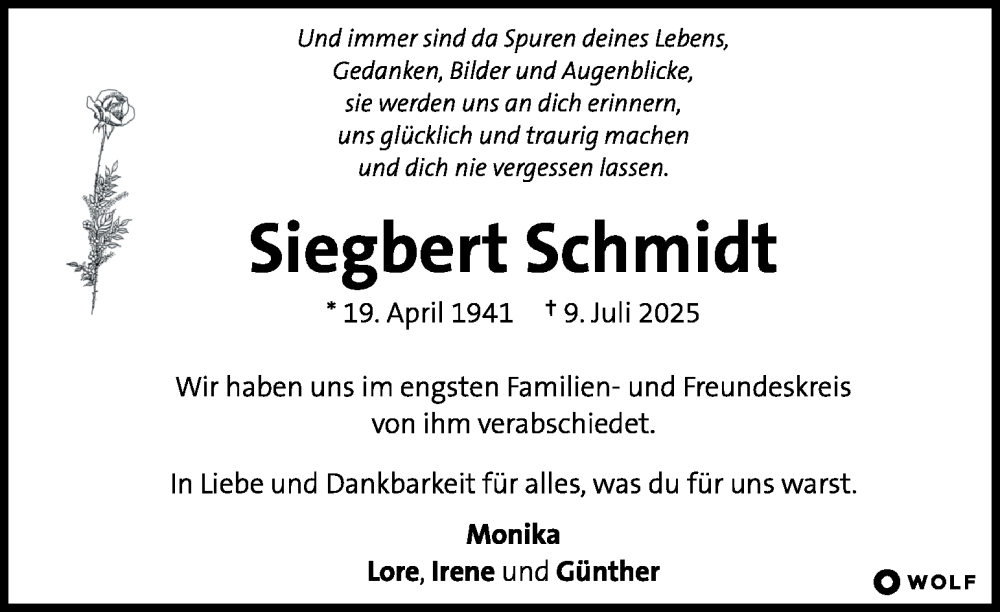 Hier finden Sie alle Traueranzeigen aus der Zeitung, die bisher für Siegbert Schmidt erschienen sind. Weitere Traueranzeigen, die in der Zeitung erscheinen, werden hier ebenfalls aufgelistet
