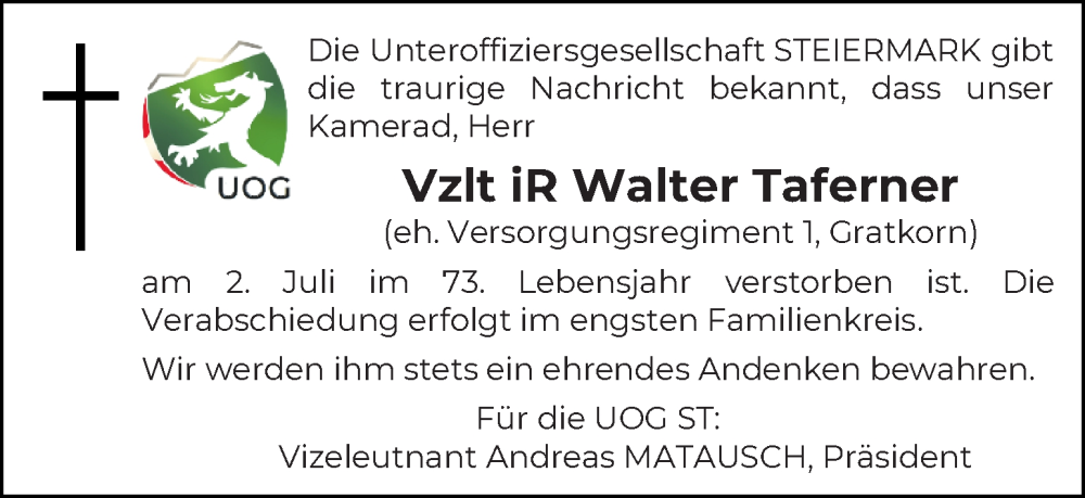 Hier finden Sie alle Traueranzeigen aus der Zeitung, die bisher für Walter Taferner erschienen sind. Weitere Traueranzeigen, die in der Zeitung erscheinen, werden hier ebenfalls aufgelistet